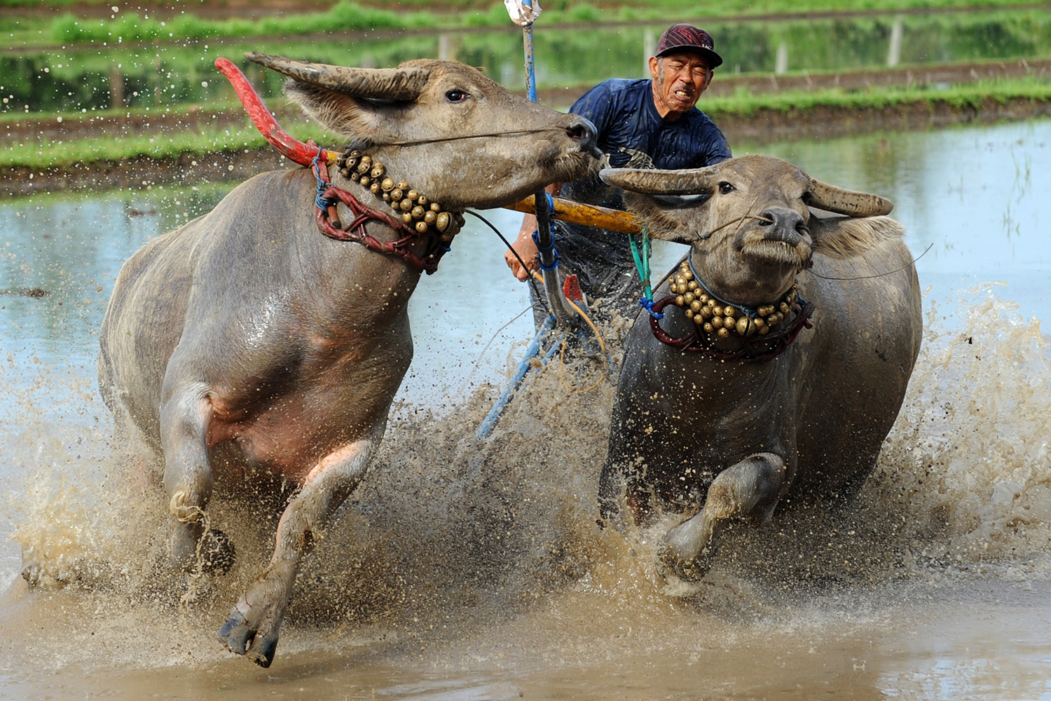The jockeys -- mostly local fanners -- balance precariously on wooden planks behind a pair of rampaging bulls as they hurtle down a dusty race course.
